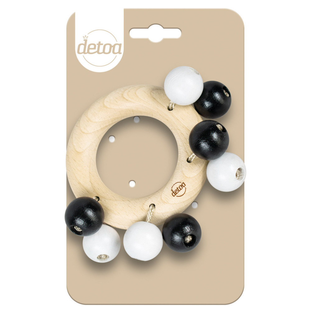 Dřevěné lehké chrastítko s černobílými kuličkami na šňůrce pomáhá rozvíjet jemnou motoriku rukou.
